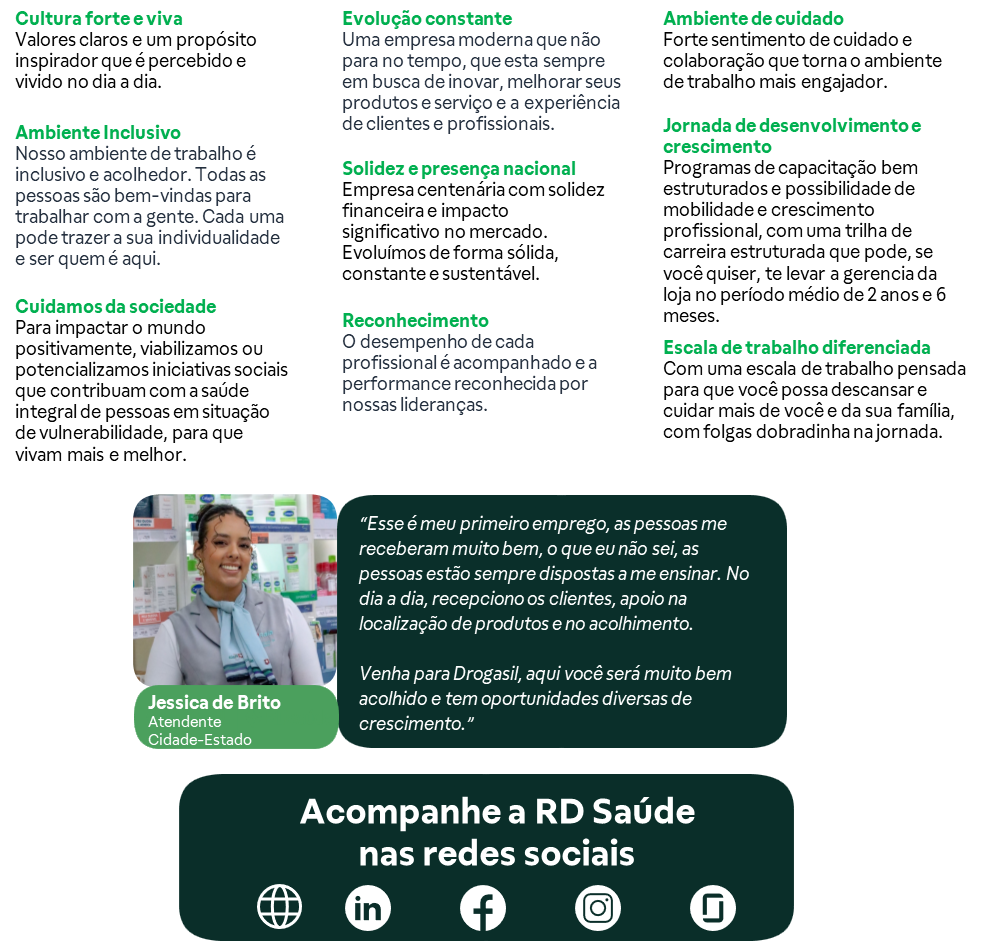 Somos líderes no mercado brasileiro de farmácias, com lojas em todo o país e mais de 60 mil pessoas apaixonadas por cuidar de gente. Trilhamos um caminho de desenvolvimento que impulsiona carreiras e transforma futuros. Juntos por uma sociedade de mais saudável impactamos mais de 1 milhão de vidas e queremos ir ainda mais longe — de forma sólida, humana e lado a lado com você. Venha fazer parte dessa jornada e trilhar um caminho que transforma carreiras e futuros.